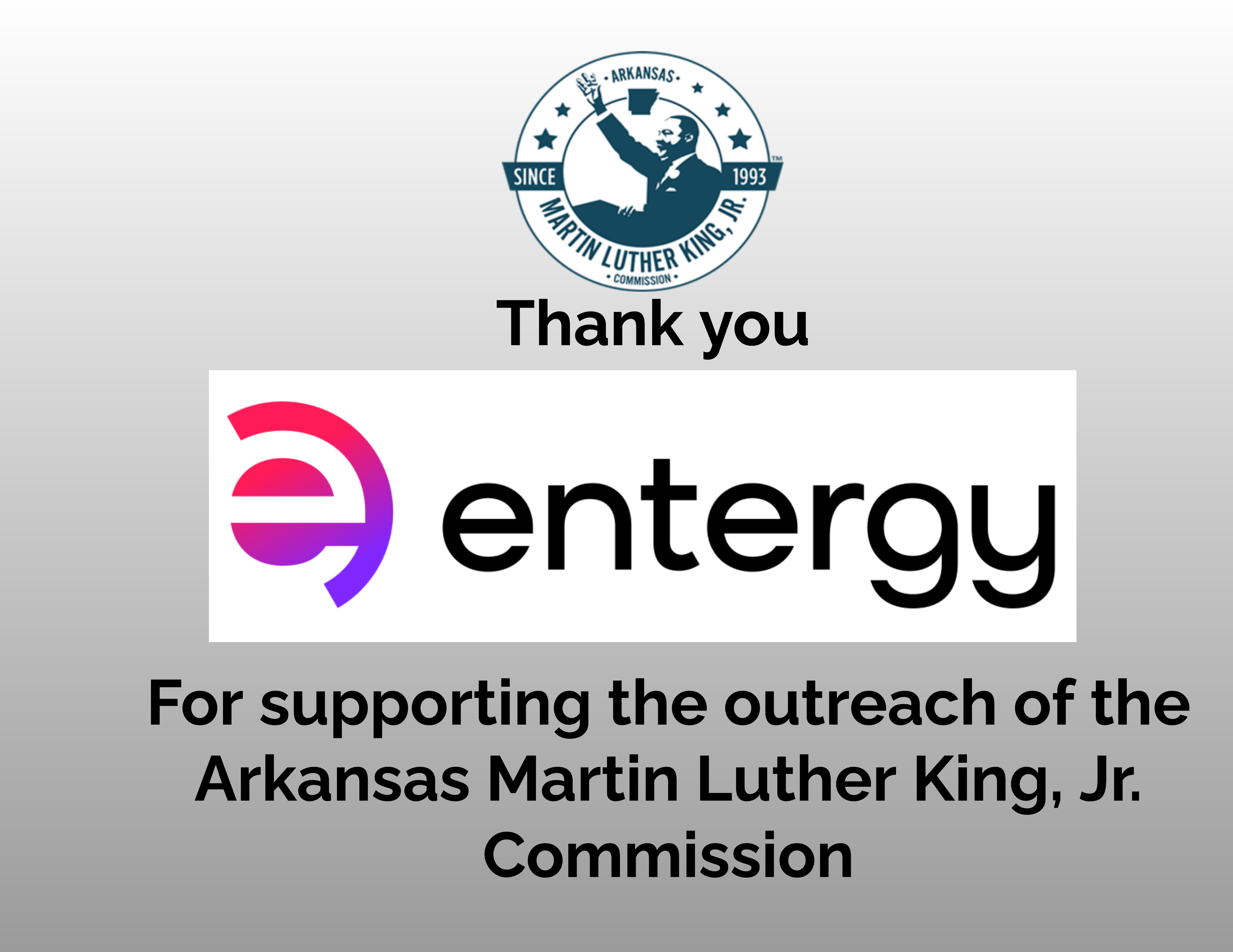 The Arkansas Martin Luther King, Jr. Commission thanks Entergy for sponsorship of the Arkansas Martin Luther King, Jr. Commission's outreach