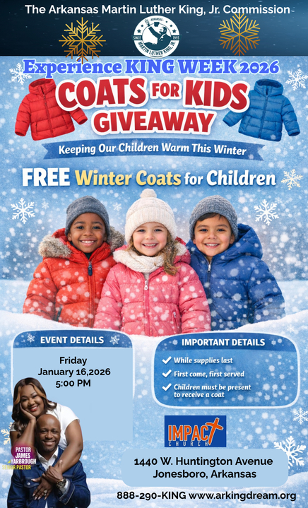 Stay warm this winter! In partnership with Impact Church of Jonesboro, we’re giving away free coats to children in need during King Week.